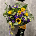 Авторский букет из сиреневых маттиол, роз Сноуфлейк, диантусов и белых альстромерий в упаковке
