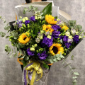 Авторский букет из пурпурной гортензии, белых фрезий, хризантемы Момоко и других цветов в упаковке