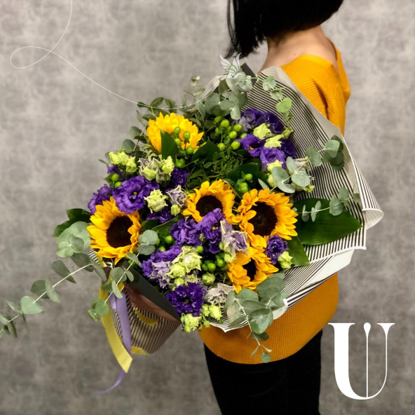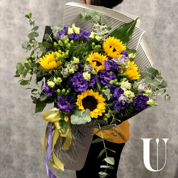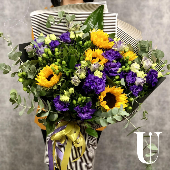 Роскошный букет из голубой гортензии и других цветов в дизайнерской упаковке