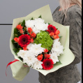 Букет цветов "Манакара" - это сборный букет, состоящий из хризантемы, гортензии, кустовой розы и минигербер.