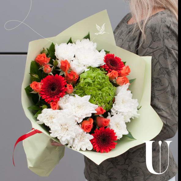 Букет оформлен в разноцветных тонах, что придает ему яркость и насыщенность. В составе букета 10 цветов, включая хризантемы, гортензии, кустовые розы и минигерберы.