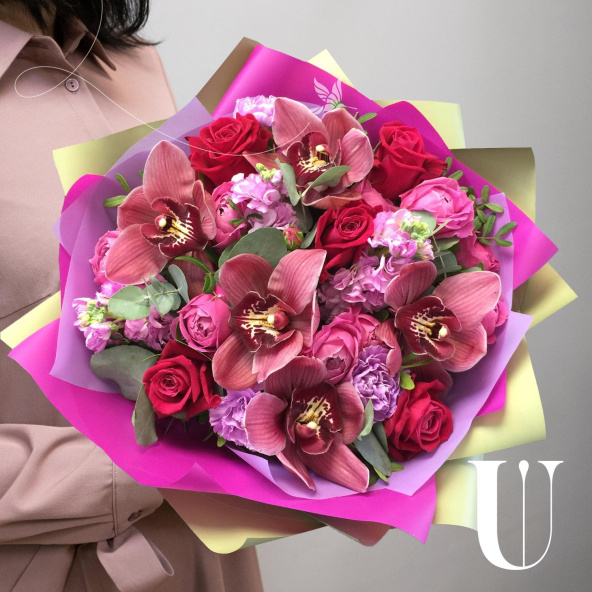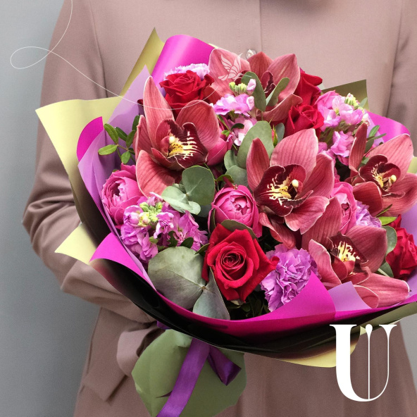 Мы перевяжем букет атласными лентами, упакуем в красивую бумагу и приложим карточку от вашего имени
