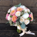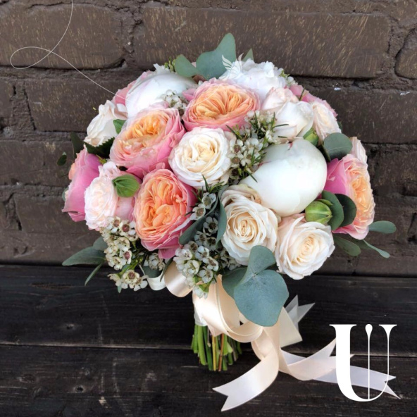 Большой авторский букет из кустовых роз Джульетта, пионов, эустомы и альстромерии