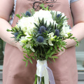 Авторский букет из пурпурной гортензии, зеленых диантусов и белых фрезий в упаковке