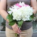 Авторский букет из диантусов Пинк, гортензий и белых маттиол в упаковке