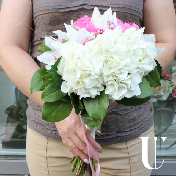 Авторский букет из розовых орхидей, белых кустовых хризантем и розовых диантусов в розовой упаковке