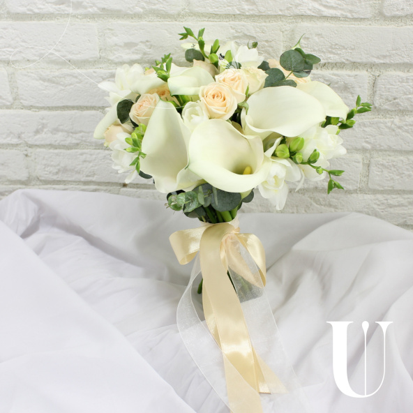 Авторский букет в белой гамме из роз Аваланж, лизиантусов и диантусов в дизайнерской упаковке