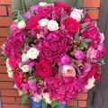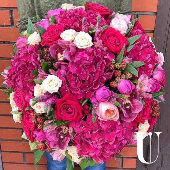 Гортензия красная - 5шт, роза "ред наоми" 50 см - 10шт, вероника розовая - 10шт, альстромерия нежно-розовая - 10шт, роза пионовижная "мисти баблз" - 10шт, орхидея цимбидиум темно-розовая - 5шт, роза кустовая кремовая "яна" - 10шт, роза пионовидная Девида остика "Джульетт" - 5шт, рубус/ежевика - 5 веток, салал/писташ