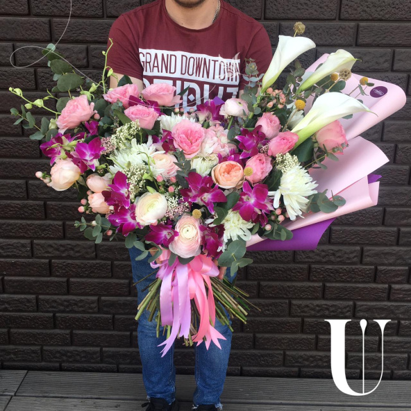 Белая одноголовая Хризантема - 6 шт, краспедия желтая- 6шт,Скабиоза Стеллата-2шт, Гиперикум розовый-13 шт, Калла Белая-3 шт,Кремовая пионовидная роза 50 см Джульетт-5 шт, Розовая пионовидная роза "Майра АФ"-10 шт ,Ранункулис Розовый Ханой-3 шт(возможна замена на другой сезонный цветок), Ранункулюс розовый-1шт,Озотамнус розовый-7 шт, Озотамнус белый -8шт, орхидея Дендробиум фиолетовый Соня-8шт, Эвкалипт Цинарея -4шт