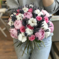 Авторский букет из роз Шангри Ла, розовых эустом и кустовых пионовидных роз Мисти Бабблз в упаковке