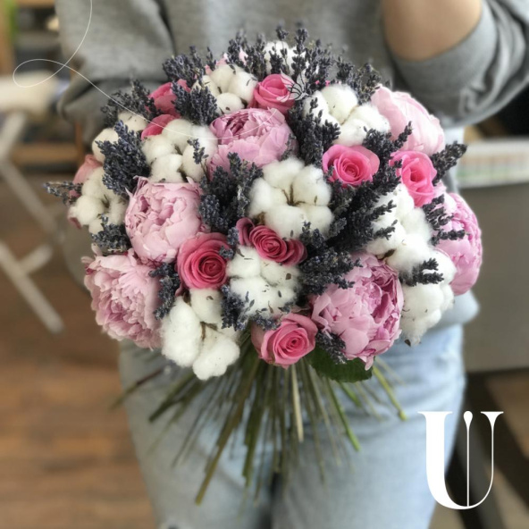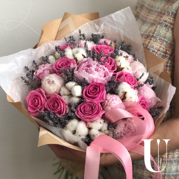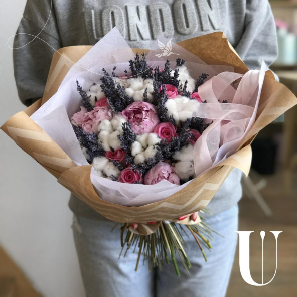 В составе пионы 10, роза аква 10, лаванда 1шт, хлопок 9. Букет упакован в крафт бумагу и перевязан атласными лентами