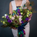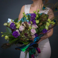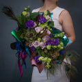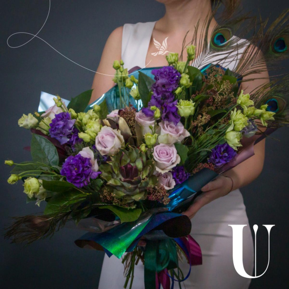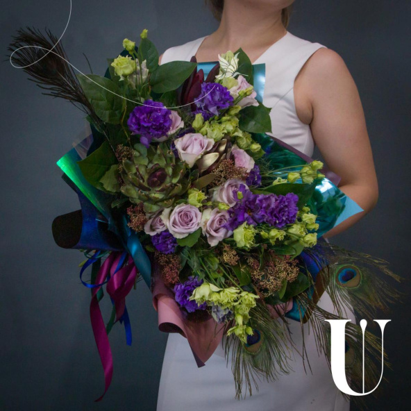 Эустома блю - 10 шт., роза морнинг дью - 9 шт., артишок/эхеверия - 1 шт., скимия - 5 шт., перья - 4 шт., зелень, фирменная упаковка