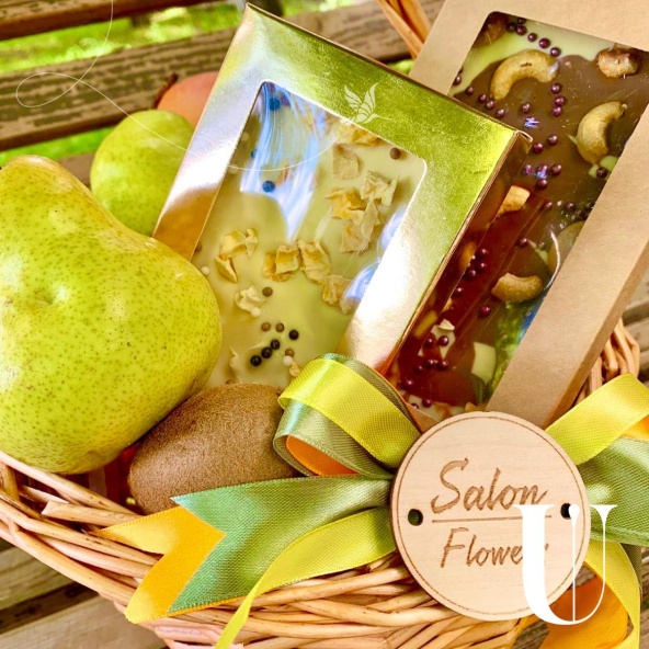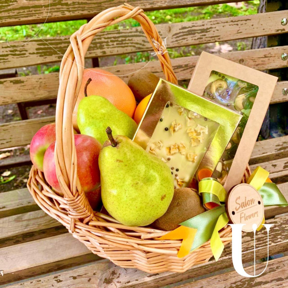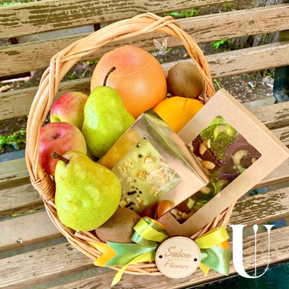 Грейпфрут-2 шт., яблоки-4 шт., груши-3 шт., киви-3 шт., апельсин-2 шт., шоколадки ручной работы-2 шт., корзина средняя