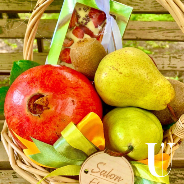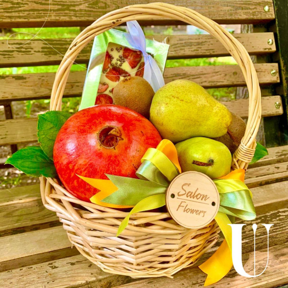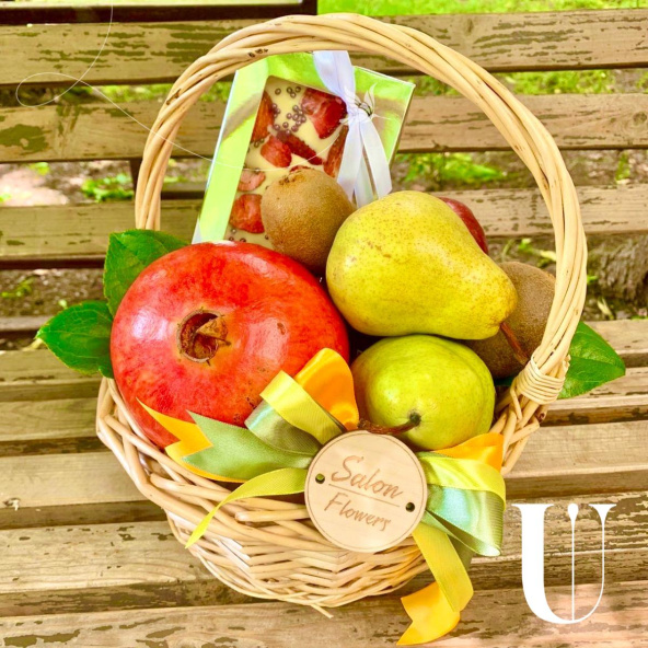 Гранат-1 шт., груши-2 шт, киви-3 шт., яблоки-2 шт., шоколадка ручной работы-1 шт., корзина малая