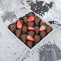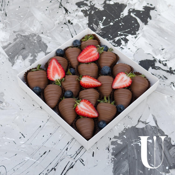 Побалуйте себя изысканным десертом - клубникой в бельгийском шоколаде callebaut с добавлением голубики и сочной голубикой. Идеальный выбор для любителей сладких блюд из категории Фирменные десерты. Размер порции - М.