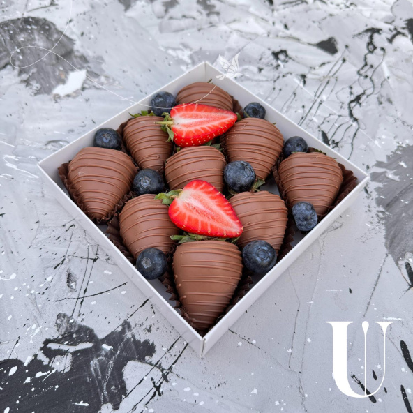 Побалуйте себя изысканным десертом - клубникой в бельгийском шоколаде callebaut с добавлением голубики и сочной голубикой. Идеальный выбор для любителей сладких блюд из категории Фирменные десерты. Размер порции - S