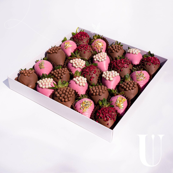 Бельгийский шоколад Сallebaut, свежая клубника 25 шт.. В композиции: сладкая и ароматная клубника в молочном и розовом шоколаде с обсыпкой из сублимированной малины, шоколадными криспи и кондитерским золотом. Флористы тщательно отбирают и моют клубнику перед изготовлением. Срок годности ягод: сутки после получения. Рекомендации по хранению: ягоды необходимо хранить в холодильнике при температуре от 4°с до 10°с. Перед употреблением подержать при комнатной температуре 15 мин