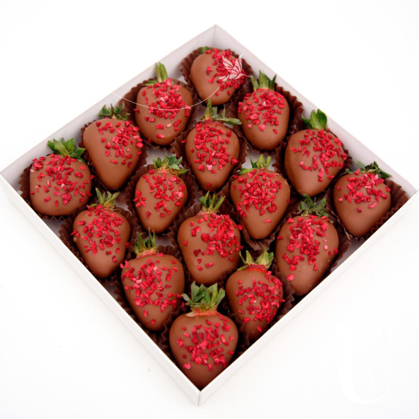 Бельгийский шоколад Сallebaut, свежая клубника 16 шт. В композиции: сладкая и ароматная клубника в молочном шоколаде с обсыпкой из сублимированной малины. Флористы тщательно отбирают и моют клубнику перед изготовлением. Срок годности ягод: сутки после получения. Рекомендации по хранению: ягоды необходимо хранить в холодильнике при температуре от 4°с до 10°с. Перед употреблением подержать при комнатной температуре 15 мин