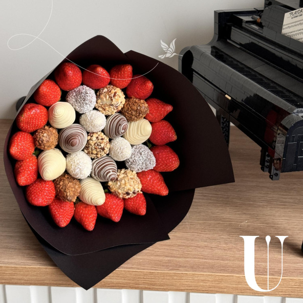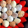 Букет из клубники в молочном и белом шоколаде с добавлением вафельной крошки, кокосовой стружки и карамельного воздушного риса