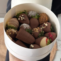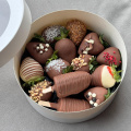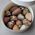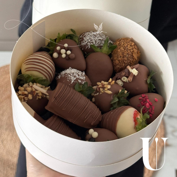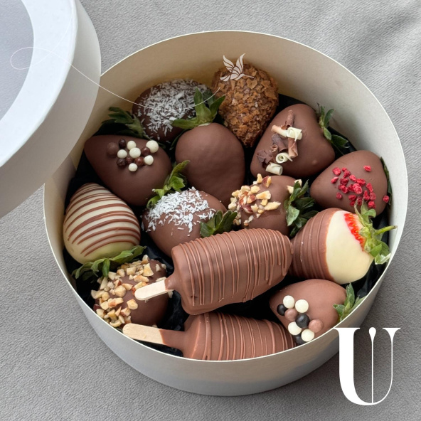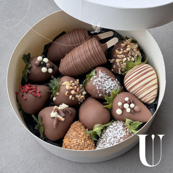Очень милый набор в круглой коробке с прозрачной крышкой. Уже ненуждающаяся в представлении потрясающая клубника в шоколаде и так же добавили банан в шоколаде!