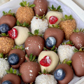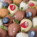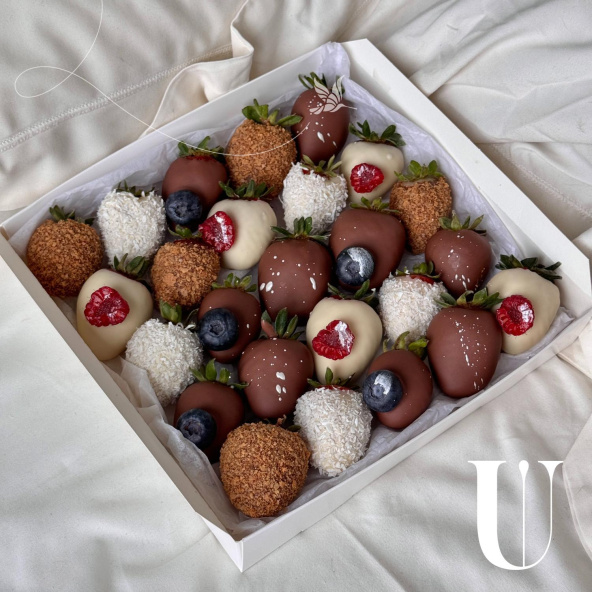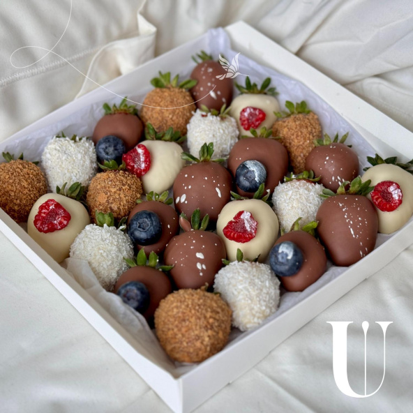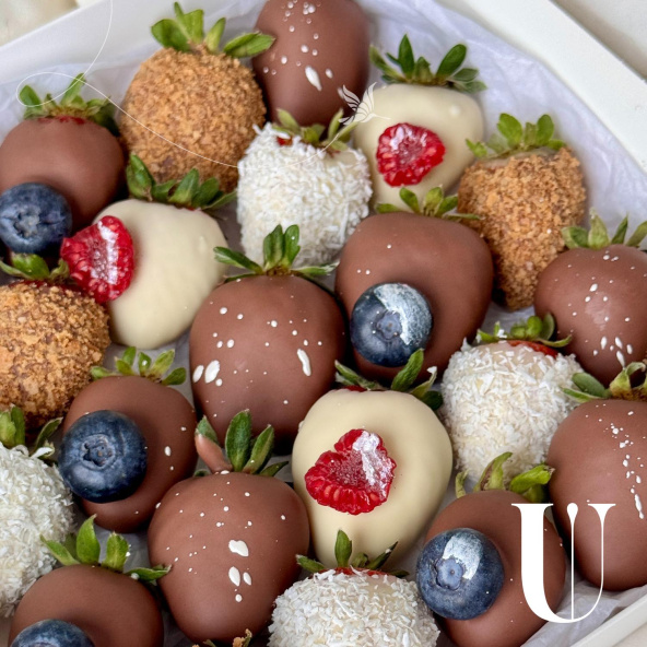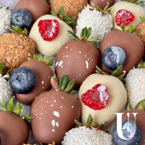 Использовали белый и молочный шоколад, добавили голубику и малину, украсили вафельной крошкой и кокосовой стружкой!