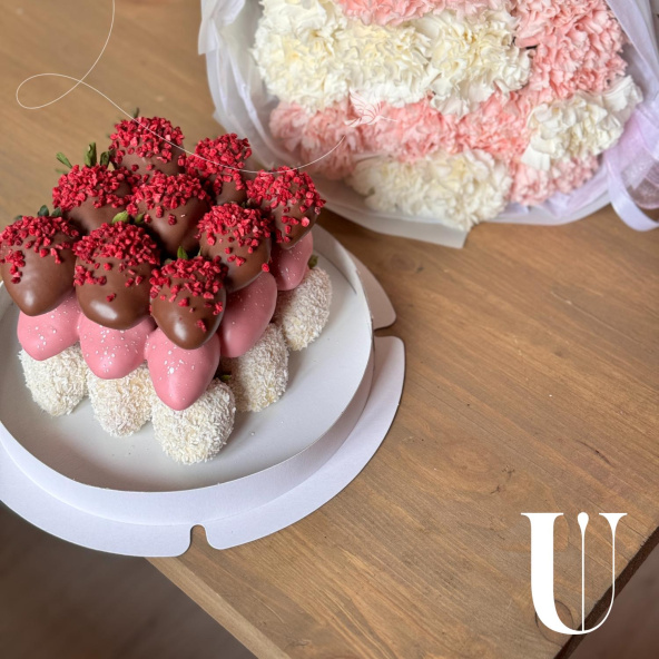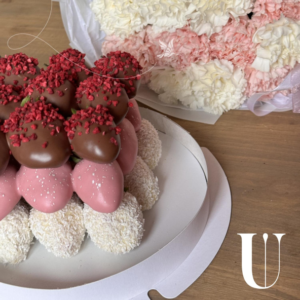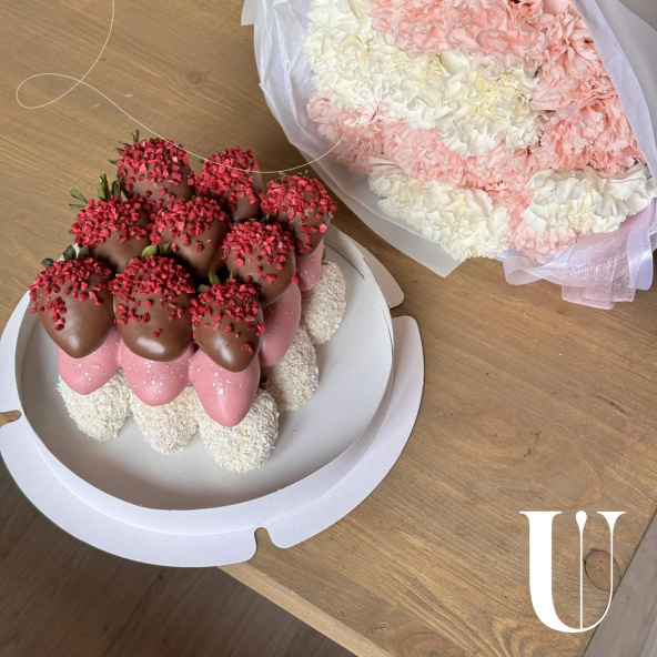 Комбо набор: торт из клубники в молочном, белом и розовом шоколаде и нежный букет из бело-розовых диантусов. Мы придумали идеальное сочетание для Вас, чтобы в один клик можно было заказать цветы и клубнику!