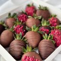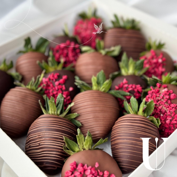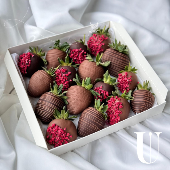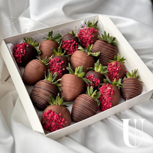 Безумно аппетитное сочетание клубники в молочном и тёмном бельгийском шоколаде, украшенной сублимированной малиной и фирменными узорами