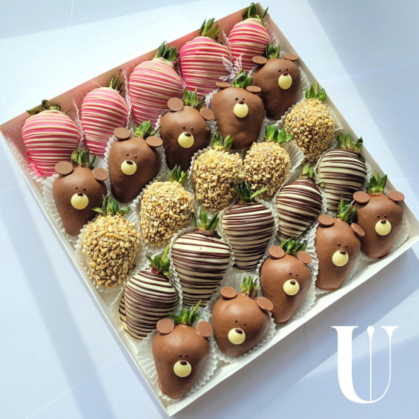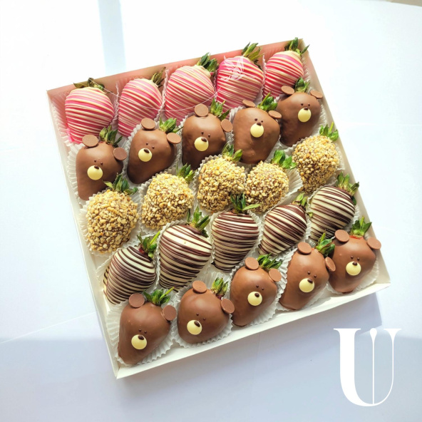 Набор из свежей клубники в нежнейшем молочном и в белом шоколаде - идеальное сочетание ягодной свежести и шоколадной мягкости, украшенное очаровательными медвежатами ручной работы.