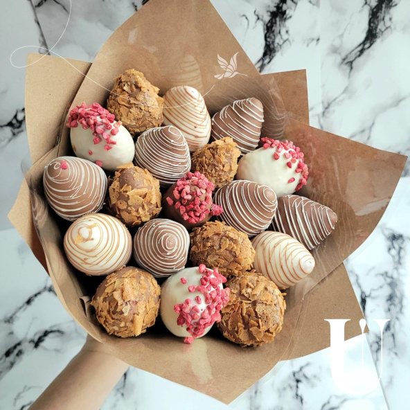 Свежие ягоды клубники в нежнейшем молочном и изысканном белом шоколаде создают уникальный десертный букет. Яркий вкус лета гармонично сочетается с мягкой сладостью шоколада, превращаясь в роскошный подарок, который порадует любого гурмана.