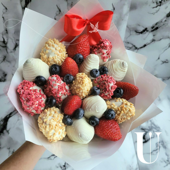 Клубника в белоснежном шоколаде с малиной, арахисом и голубой искрой