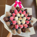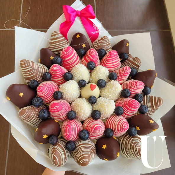 Букет из свежих ягод и клубники, бережно заключённых в три вида шоколада с нежными нотками свежей голубики. Идеальное сочетание вкусов для настоящих гурманов.