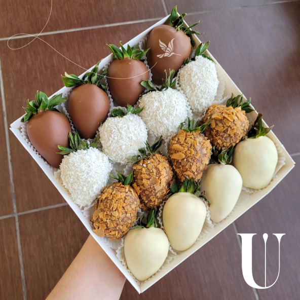 Набор из свежих ягод клубник в молочном и в белом шоколаде с добавлением сладкой вафельной крошки и кокосовой стружки.