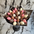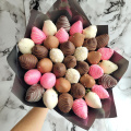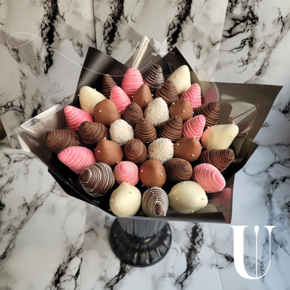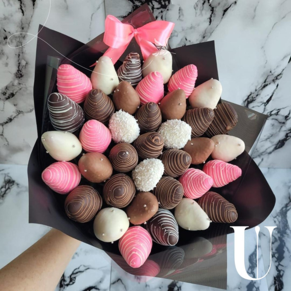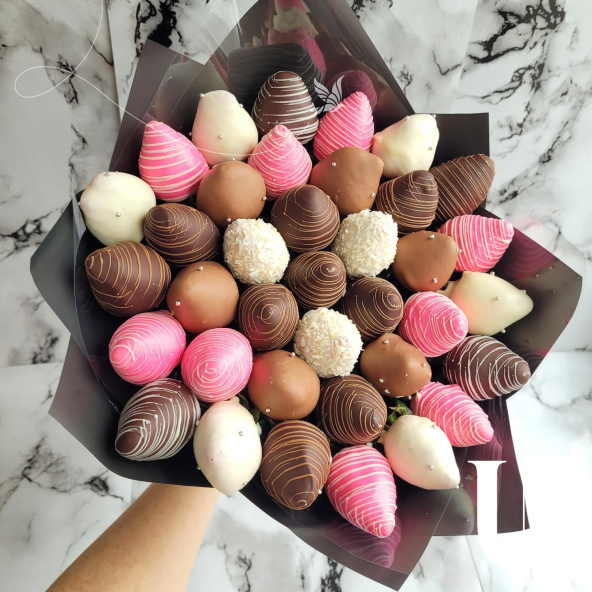 Букет из свежей клубники, покрытой слоями нежнейшего молочного, насыщенного тёмного и деликатного белого шоколада. Идеальное сочетание ягодной свежести и шоколадного богатства.