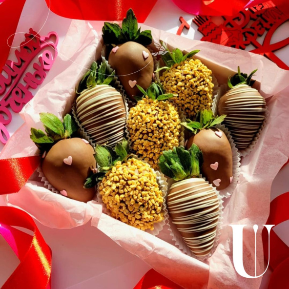 Изумительный десерт для любителей необычных вкусовых сочетаний. Свежие ягоды клубники покрыты нежным слоем молочного шоколада с добавлением обжаренного арахиса.Приятный кисло-сладкий вкус клубники гармонично дополняют кремовая сладость шоколада и аппетитный аромат орешков. Идеально подходит для праздничного стола или романтического ужина.