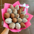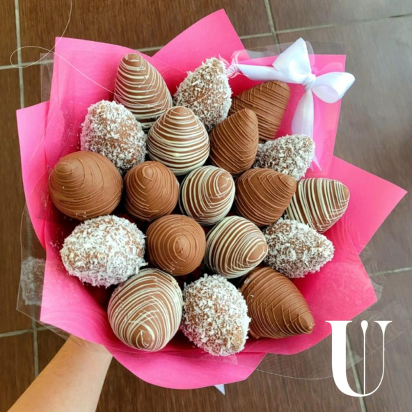 Изумительный букет из свежей ароматной клубники, покрытой нежнейшим слоем молочного шоколада и украшенной хрустящей кокосовой стружкой станет изысканным подарком любимым людям или вкусным украшением праздничного стола.