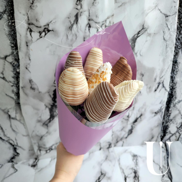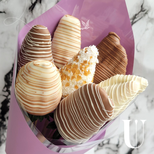 Компактный букетик из свежей ароматной клубники покрыт нежнейшими слоями белого и молочного шоколада. Идеален как миниатюрный презент-сюрприз или украшение праздничного стола.