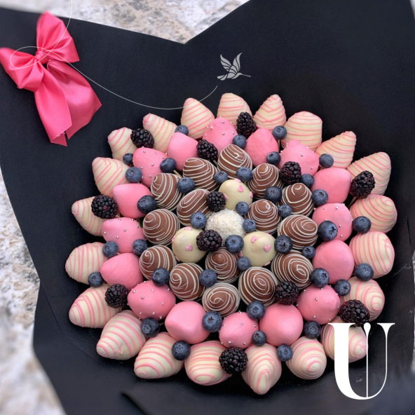 - В данном размере букета- 55 ягод отборной и крупной клубники. А так же добавление ягод голубики и ежевики.Средний вес букета- 3.3 кг!