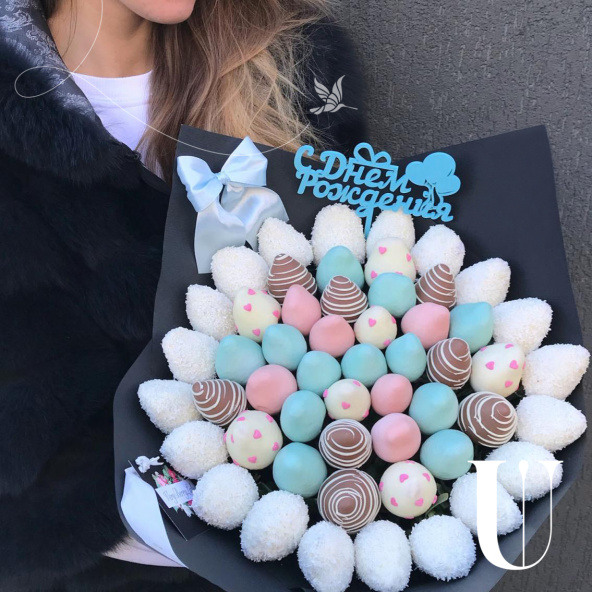 В данном размере букета - 55 ягод отборной и крупной клубники. Средний вес букета - 3.3 кг!