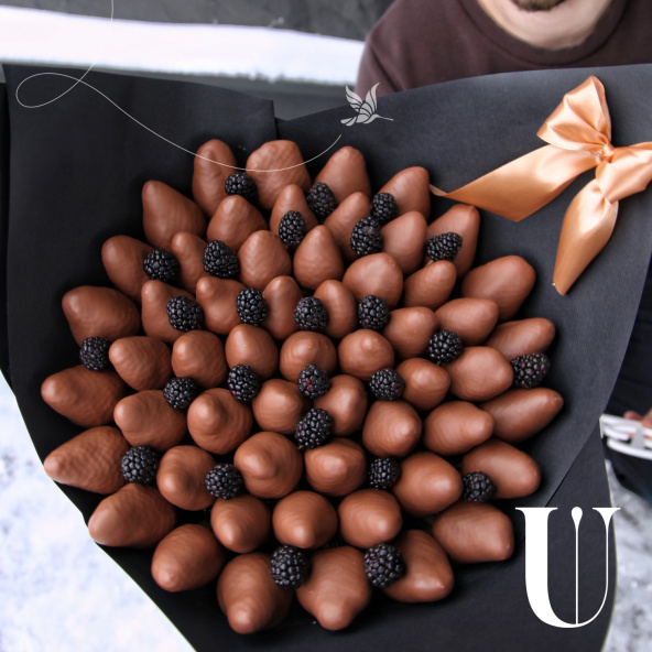 В данном размере букета - до 55 ягод отборной и крупной клубники.А так же добавление ягод ежевики Средний вес букета - 3.3 кг!