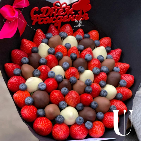 В данном размере букета - 55 ягод отборной и крупной клубники.А так же добавление ягод голубики Средний вес букета - 3.3 кг!