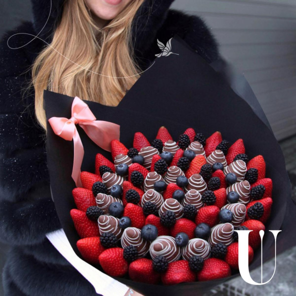 В данном размере букета - 55 ягод отборной и крупной клубники.А так же добавление ягод голубики и ежевики Средний вес букета - 3.3 кг!