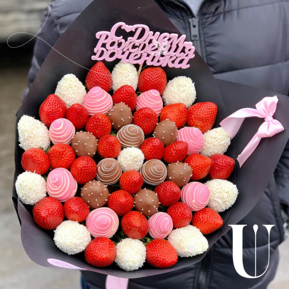 В данном размере букета - 55 ягод отборной и крупной клубники. Средний вес букета - 3.3 кг!