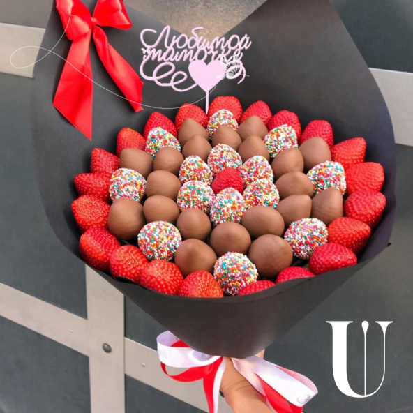 В данном размере букета - 55 ягод отборной и крупной клубники. Средний вес букета - 3.3 кг!