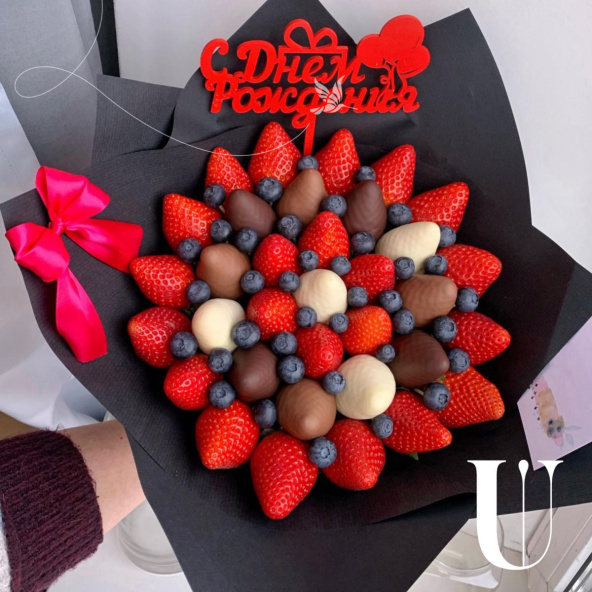 - В данном размере букета- 35 ягод отборной и крупной клубники.А так же добавление ягод голубики Средний вес букета- 2.1 кг!