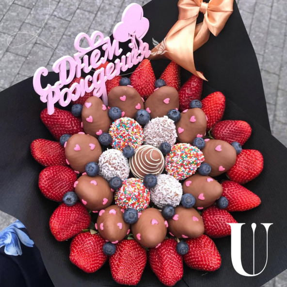 В данном размере букета- 35 ягод отборной и крупной клубники. А так же добавление ягод голубикиСредний вес букета- 2.1 кг!