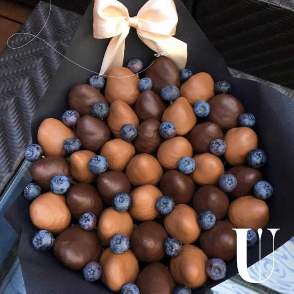 В данном размере букета- 35 ягод отборной и крупной клубники.А так же добавление ягод голубики. Средний вес букета- 2.1 кг!
