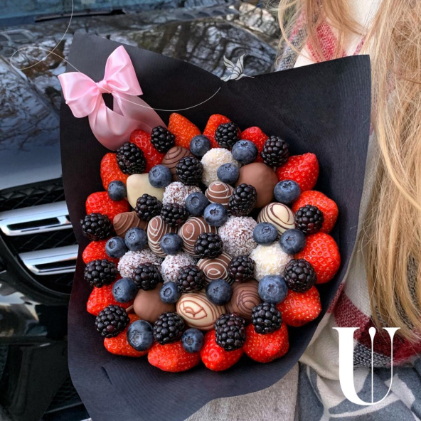 - В данном размере букета - до 35 ягод отборной и крупной клубники.А так же добавление ягод голубики и ежевики. Средний вес букета- 2.1 кг!