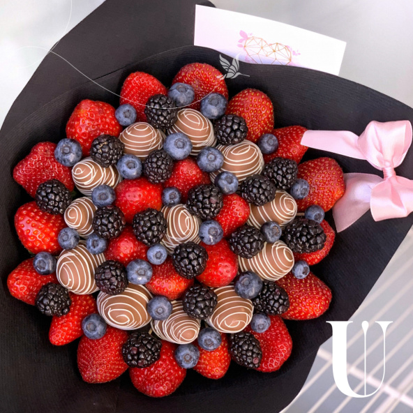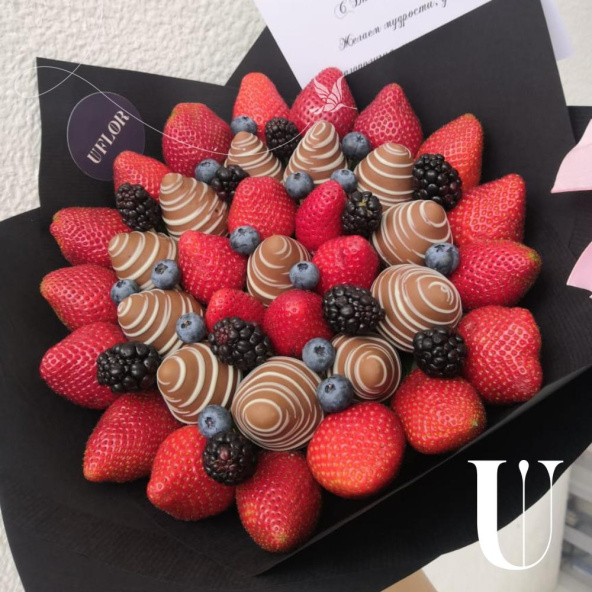 - В данном размере букета - до 35 ягод отборной и крупной клубники.А так же добавление ягод голубики и ежевики. Средний вес букета- 2.1 кг!
