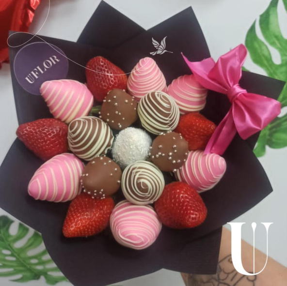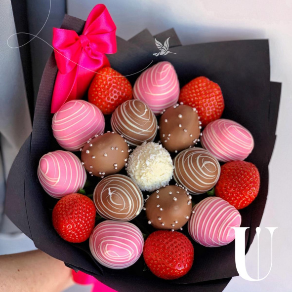 В данном размере букета помещается до 23 ягод отборной и крупной клубники. Средний вес букета- 600 г!