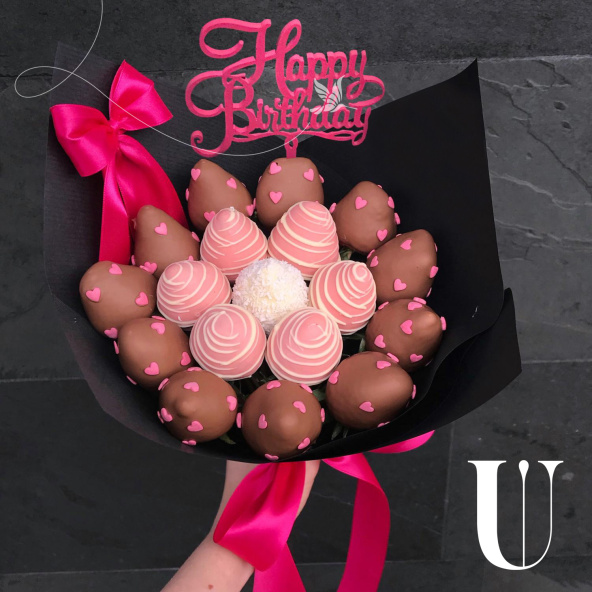 В данном размере букета помещается до 23 ягод отборной и крупной клубники. Средний вес букета- 600 г!